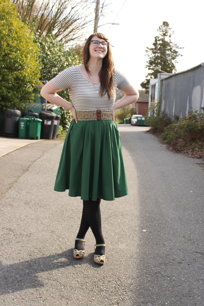 Well, despite the pouring rain, the sunshine on Sunday sure made for a nice weekend! Now that it's starting to warm up a bit and we're having some dry days here and there, I've been busting out my favorite warmer weather pieces, like these dreamy Swedish Hasbeens. Even after practically living in these puppies last summer, I still can't get over the cute cut-outs on these shoes. So in love. I also finally ironed my favorite green skirt, so I decided to pair the two with a striped t-shirt and some black tights.